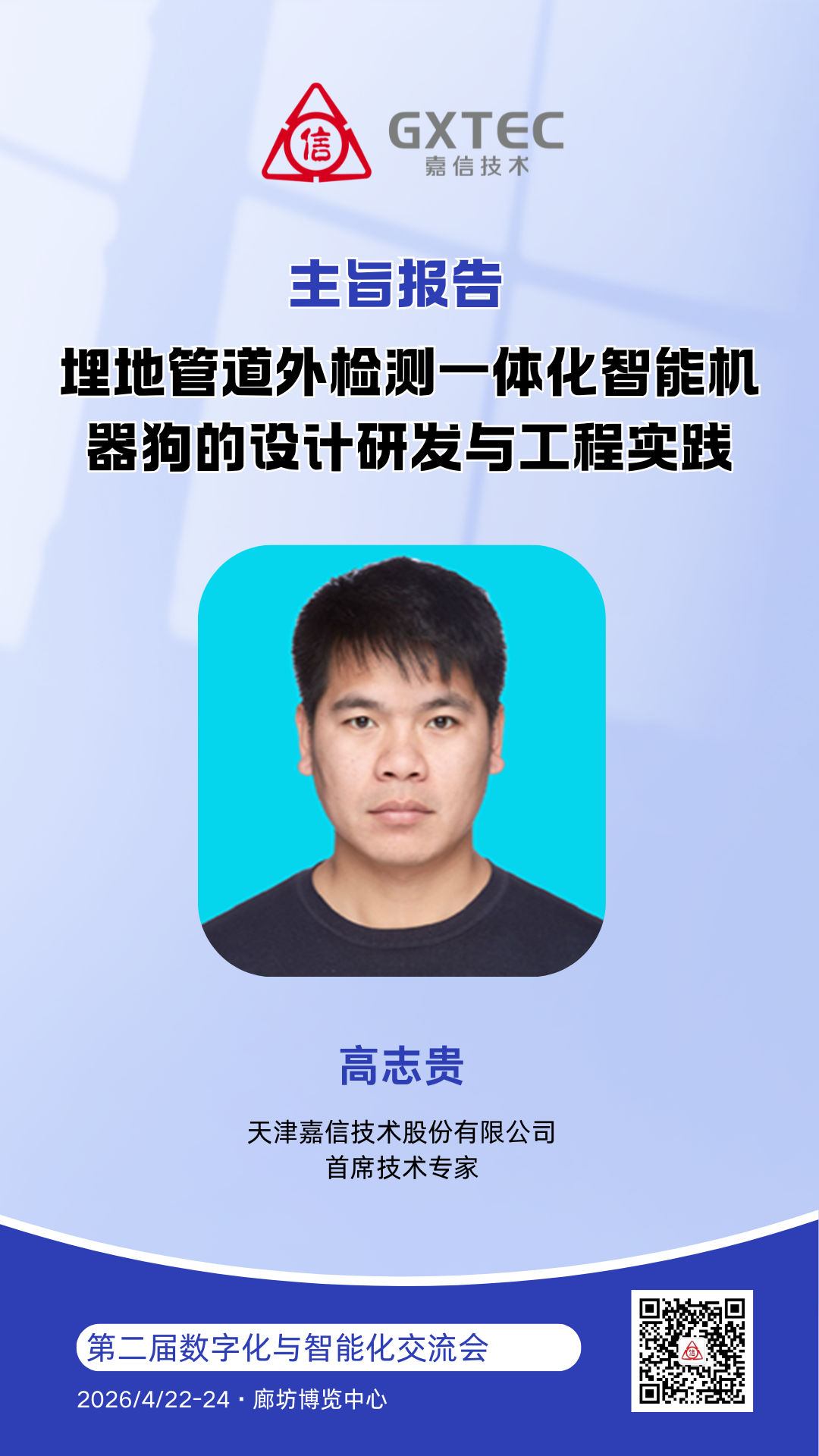 嘉信技术首席技术专家高志贵将发表题为《埋地管道外检测一体化智能机器狗的设计研发与工程实践》的主旨演讲,系统分享嘉信技术在智能检测领域的研究积淀与工程实践成果。